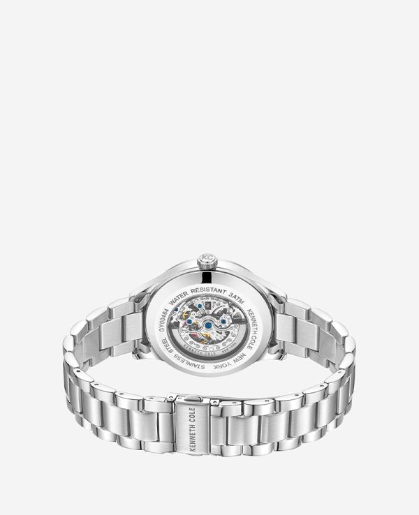 - Hour/minute/seconds hands in silver-tone finish