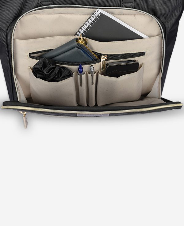 - A zip around front organization compartment on the tote features open slip pockets, pen loops, and a zippered pocket that hold all your business essentials