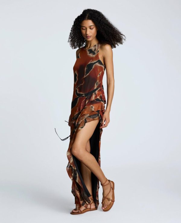 - Side slit with tiered ruffle detail