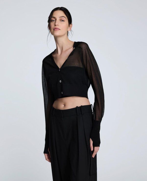 Kenneth Cole Women’s Cropped Cardigan with Saddle Shoulders & Thumbholes – Black Semi-Sheer